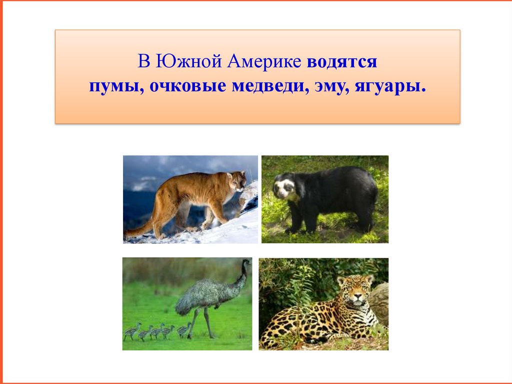 В Южной Америке водятсяпумы, очковые медведи, эму, ягуары.