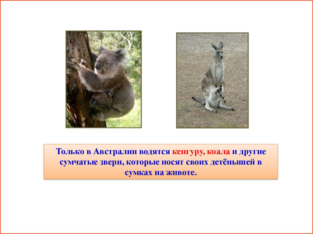 Только в Австралии водятся кенгуру, коала и другиесумчатые звери, которые носят своих детёнышей в