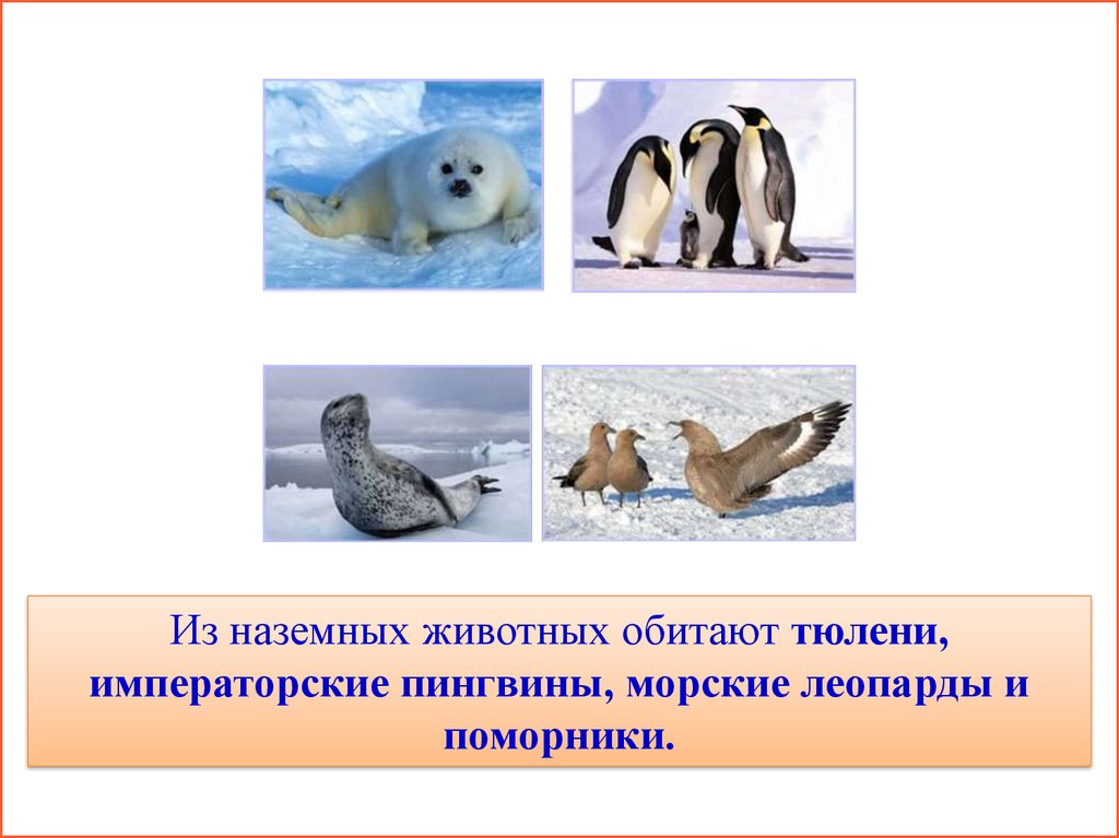Из наземных животных обитают тюлени,императорские пингвины, морские леопарды и