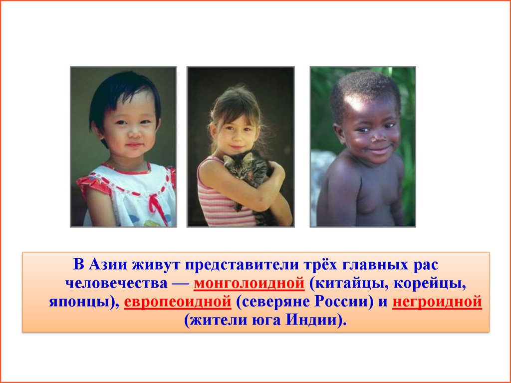 В Азии живут представители трёх главных расчеловечества — монголоидной (китайцы, корейцы,