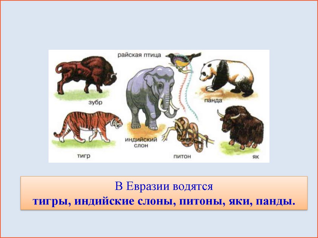 В Евразии водятсятигры, индийские слоны, питоны, яки, панды.