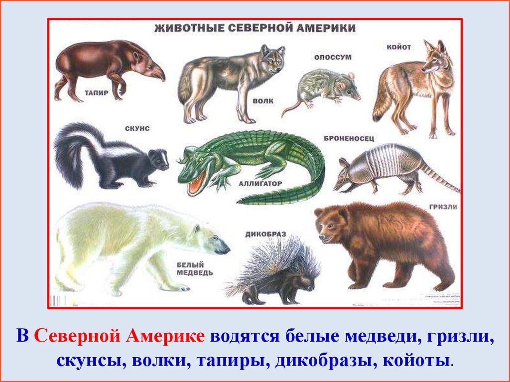 В Северной Америке водятся белые медведи, гризли,скунсы, волки, тапиры, дикобразы, койоты.
