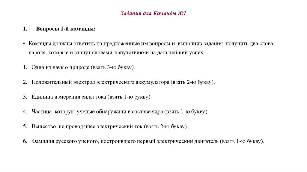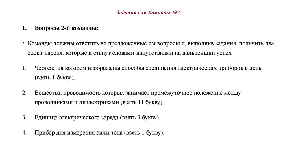 • Команды должны ответить на предложенные им вопросы и, выполнив задания, получить два словапароля, которые и станут словами-напутствиями на дальнейший успех