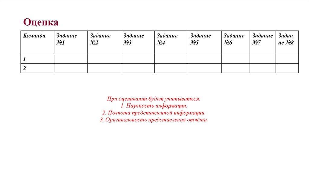• Команды должны ответить на предложенные им вопросы и, выполнив задания, получить два