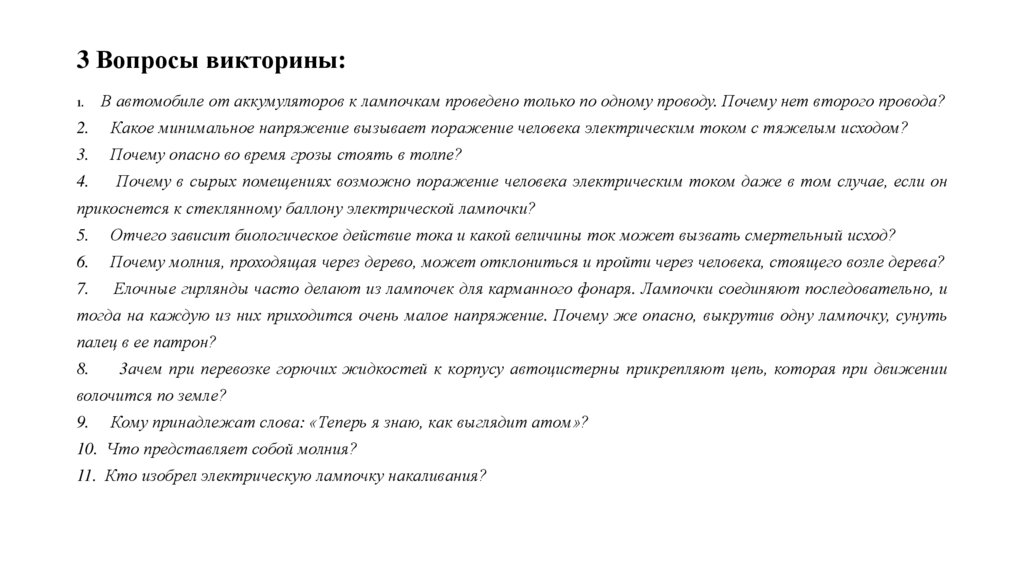 Ответить на вопросы викторины «Электрический ток и безопасность