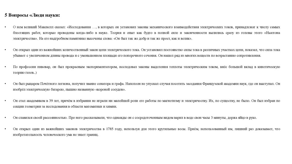 5 Вопросы «Люди науки:О нем великий Максвелл сказал: «Исследования …, в которых он установил законы механического взаимодействия электрических токов, принадлежат к числу самых