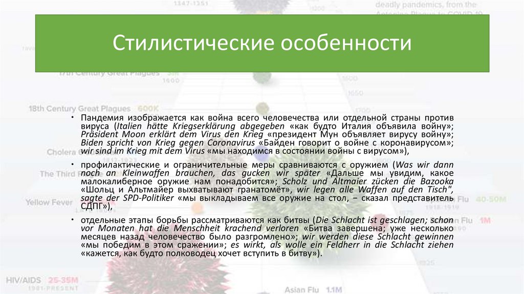 Стилистические особенностиПандемия изображается как война всего человечества или отдельной страны против