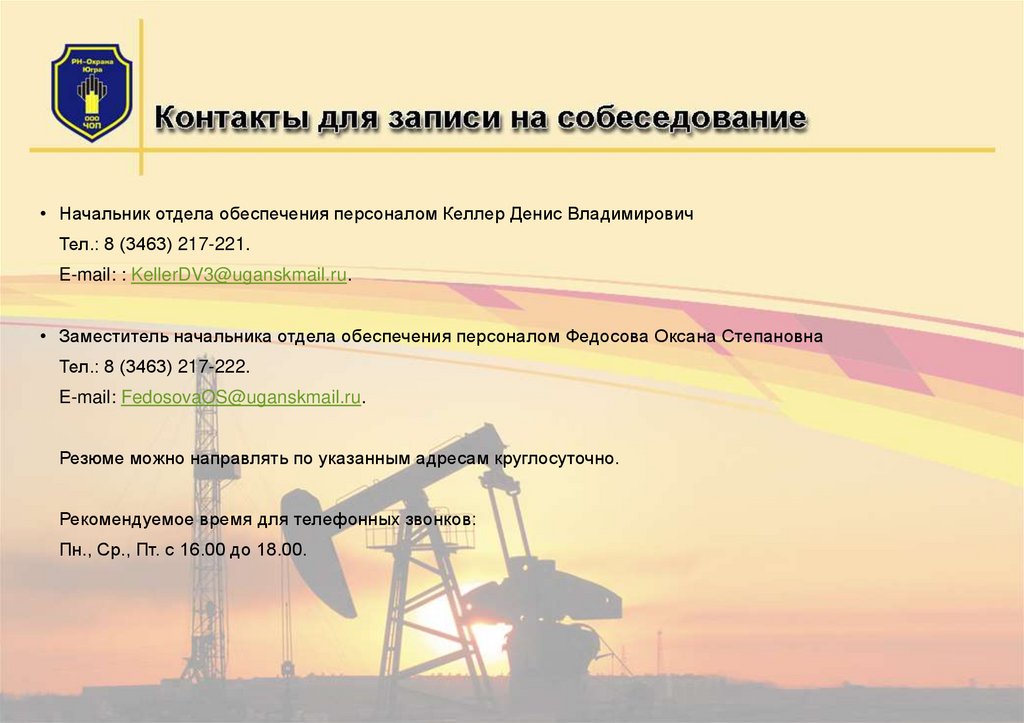 • Начальник отдела обеспечения персоналом Келлер Денис ВладимировичТел.: 8 (3463) 217-221.