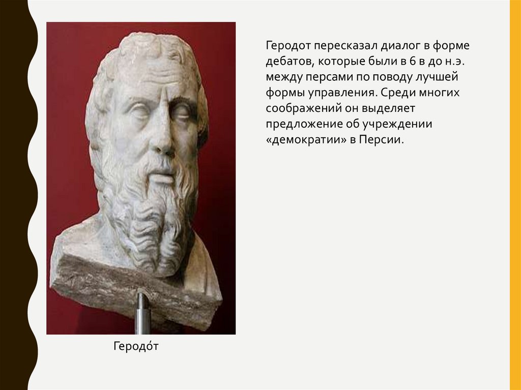Геродот пересказал диалог в формедебатов, которые были в 6 в до н.э.