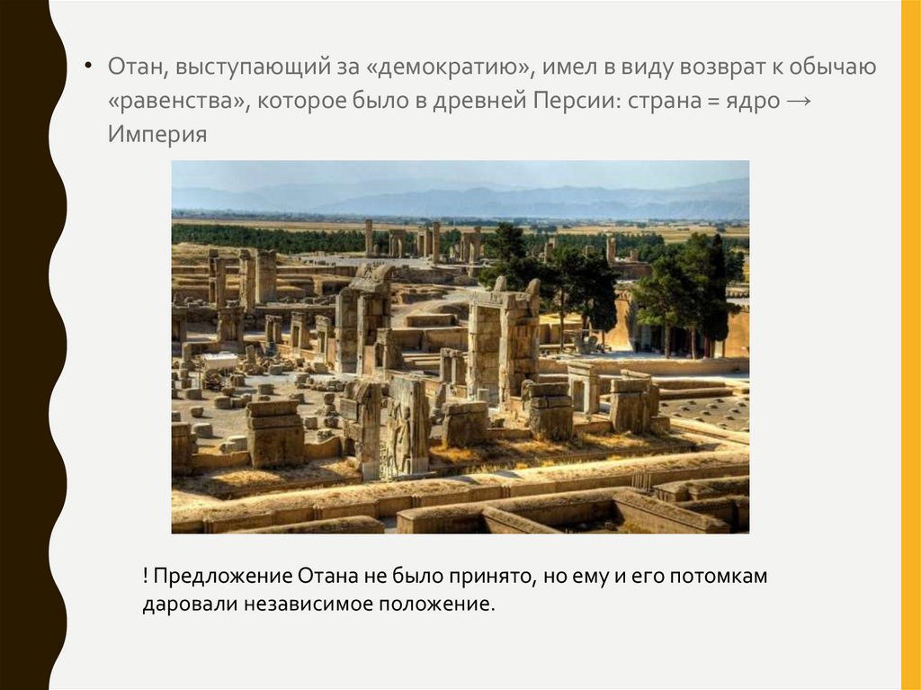• Отан, выступающий за «демократию», имел в виду возврат к обычаю«равенства», которое было в древней Персии: страна = ядро →