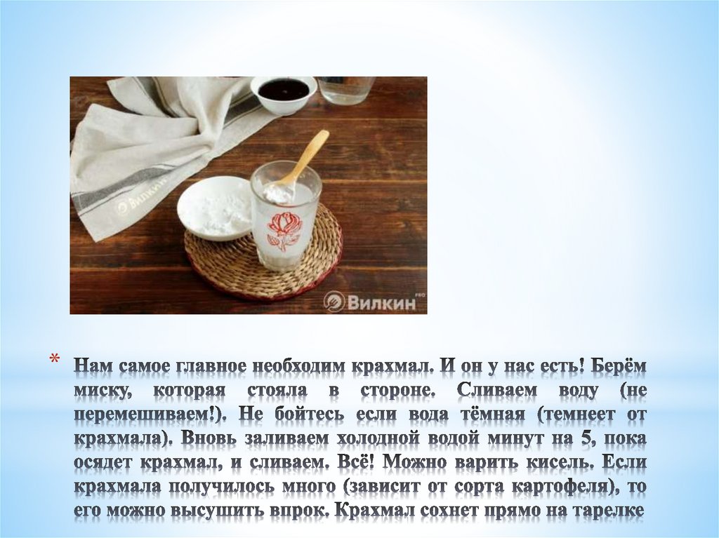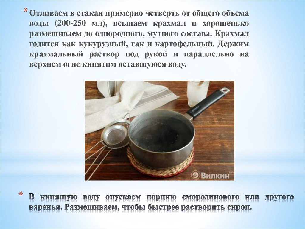* Отливаем в стакан примерно четверть от общего объемаводы (200-250 мл), всыпаем крахмал и хорошенько