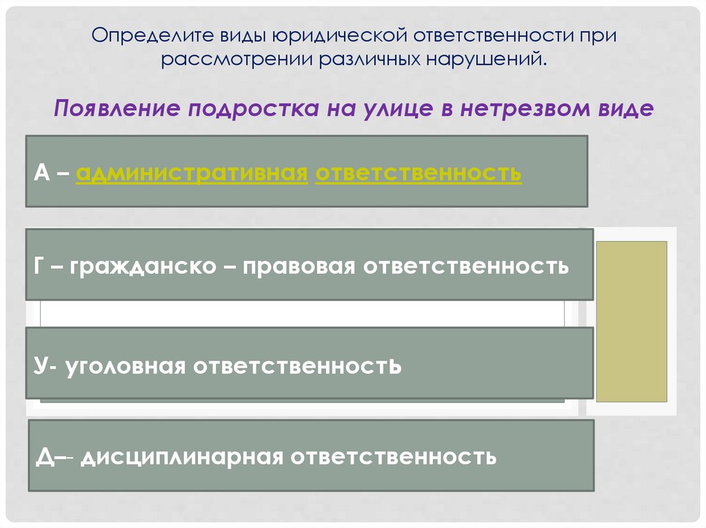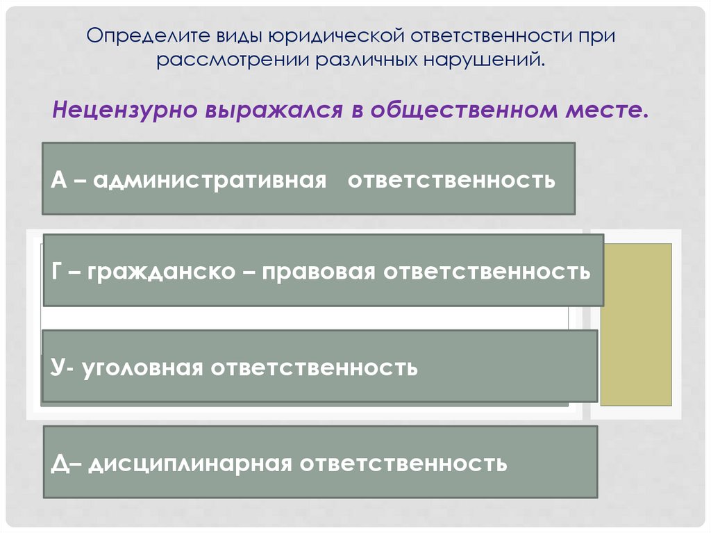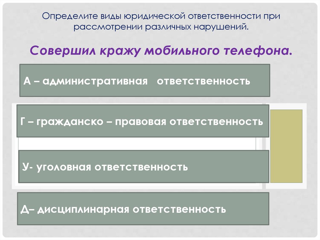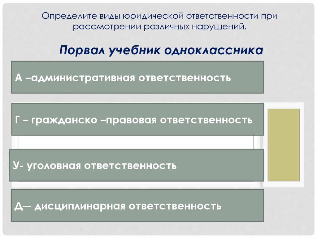 Определите виды юридической ответственности прирассмотрении различных нарушений.