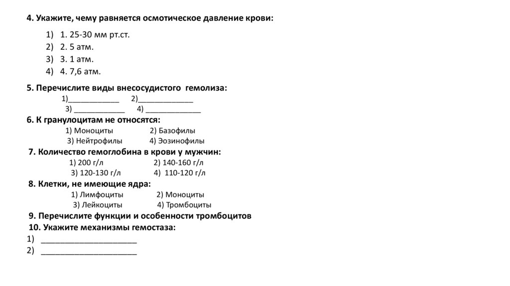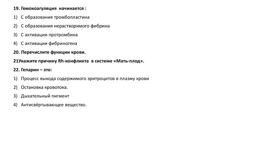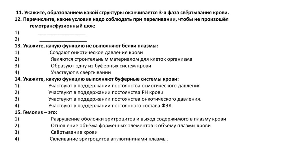 11. Укажите, образованием какой структуры оканчивается 3-я фаза свёртывания крови.12. Перечислите, какие условия надо соблюдать при переливании, чтобы не произошёл