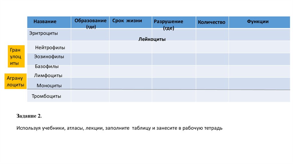 «Кровь»Цель работы: используя учебники, атласы, лекции, заполнить таблицы,