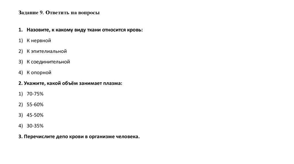 Задание 9. Ответить на вопросы1. Назовите, к какому виду ткани относится кровь: