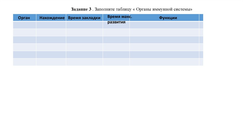 Задание 3 . Заполните таблицу « Органы иммунной системы»Орган