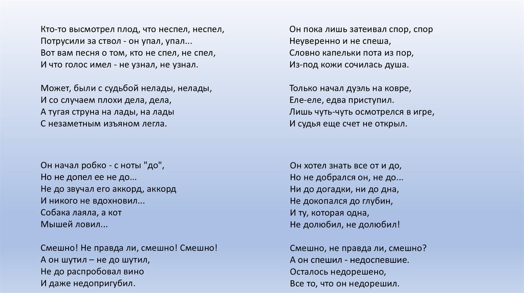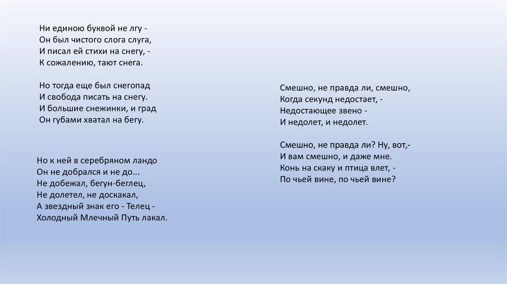 Ни единою буквой не лгу Он был чистого слога слуга,И писал ей стихи на снегу, К сожалению, тают снега.