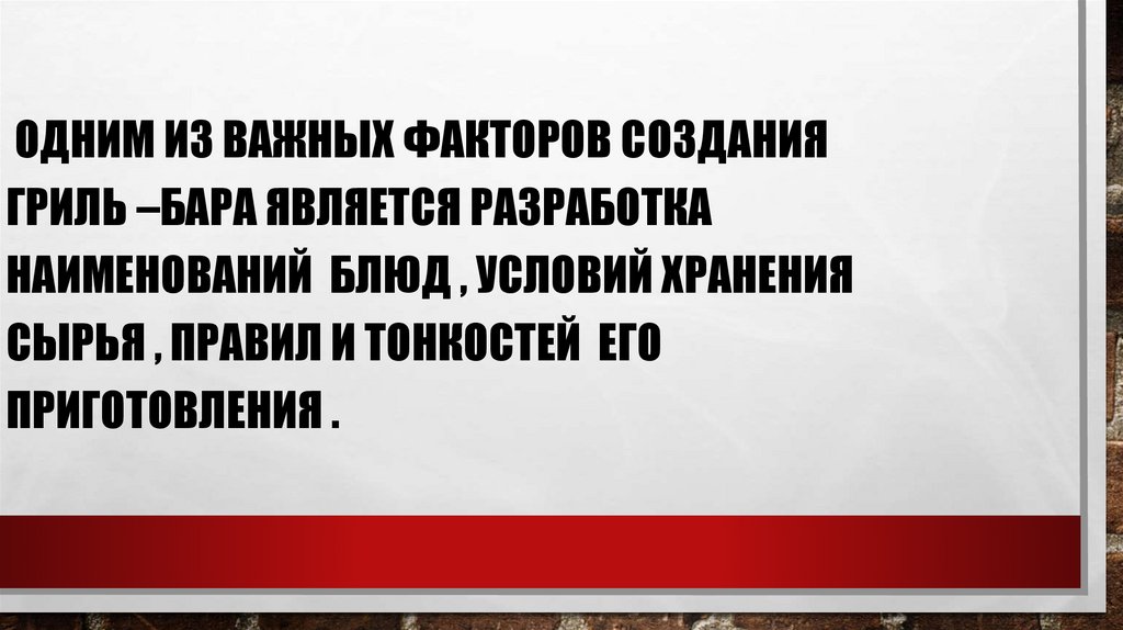 ОДНИМ ИЗ ВАЖНЫХ ФАКТОРОВ СОЗДАНИЯГРИЛЬ –БАРА ЯВЛЯЕТСЯ РАЗРАБОТКА