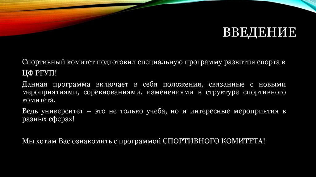ВВЕДЕНИЕСпортивный комитет подготовил специальную программу развития спорта в