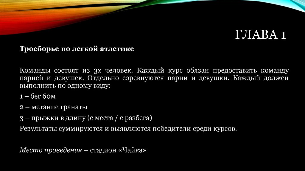 парней и девушек. Отдельно соревнуются парни и девушки. Каждый должен
