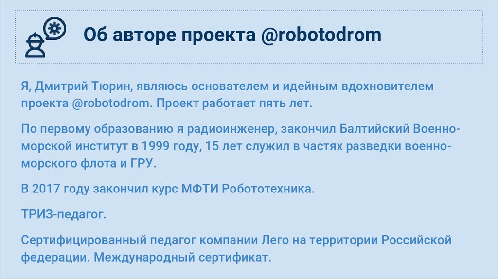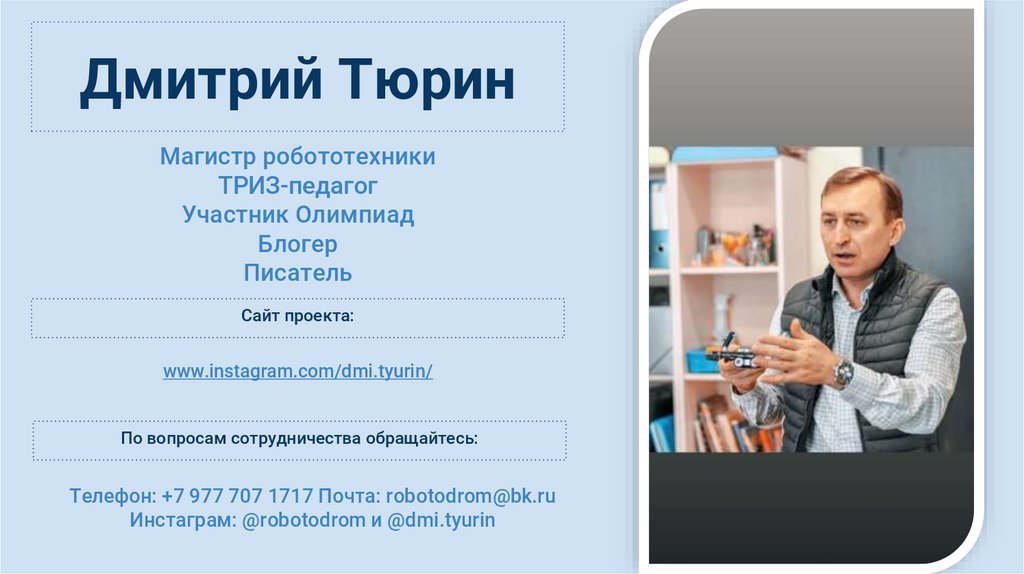 Об авторе проекта @robotodromЯ, Дмитрий Тюрин, являюсь основателем и идейным вдохновителем