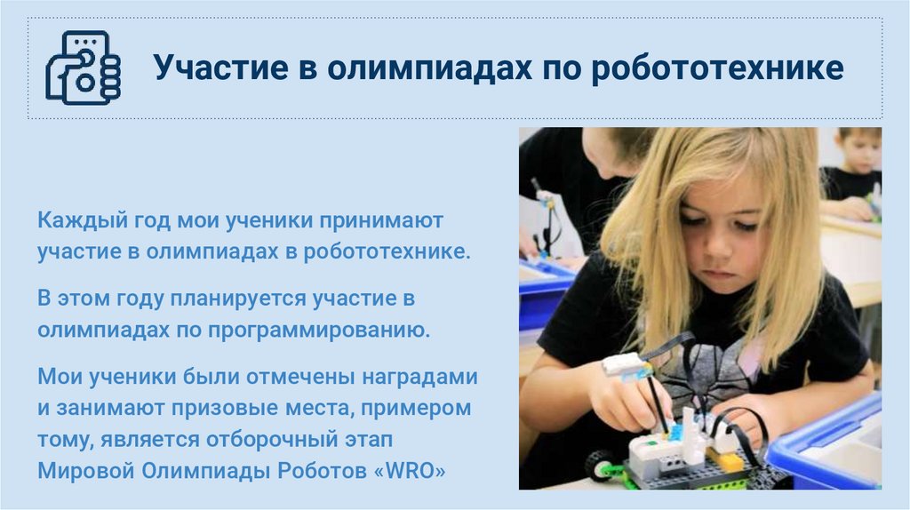 Участие в олимпиадах по робототехникеКаждый год мои ученики принимают