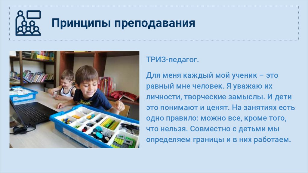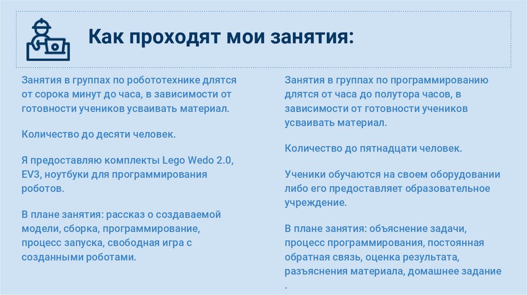 Как проходят мои занятия:Занятия в группах по робототехнике длятся