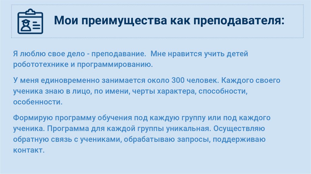 Мои преимущества как преподавателя:Я люблю свое дело - преподавание. Мне нравится учить детей
