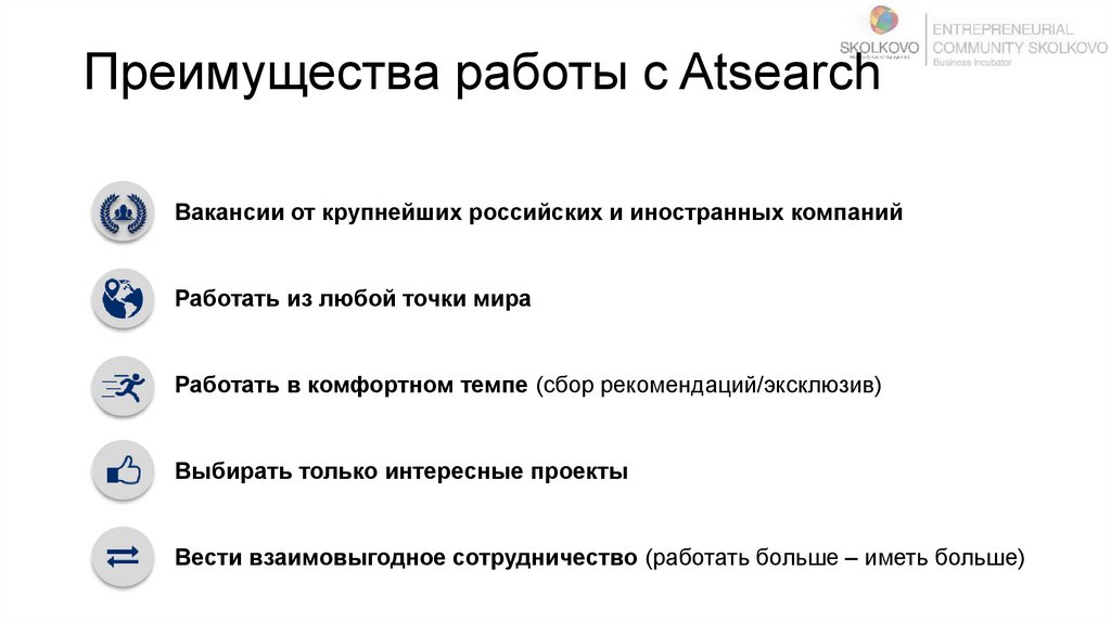 Преимущества работы с AtsearchВакансии от крупнейших российских и иностранных компаний