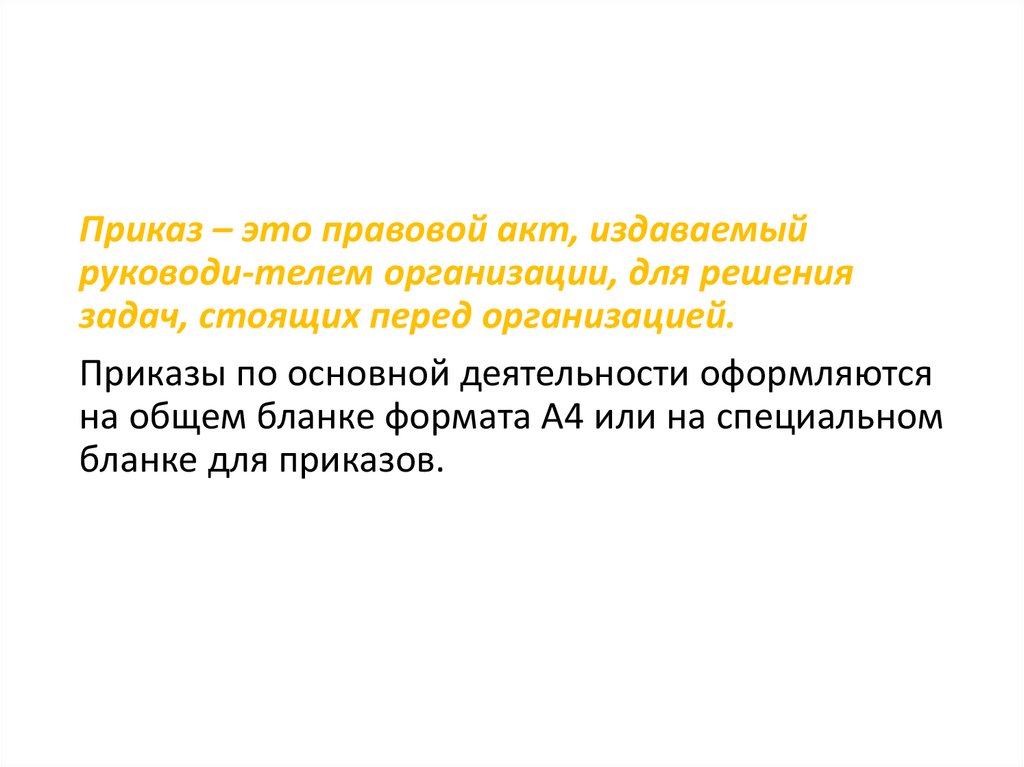 Приказ – это правовой акт, издаваемыйруководи-телем организации, для решения
