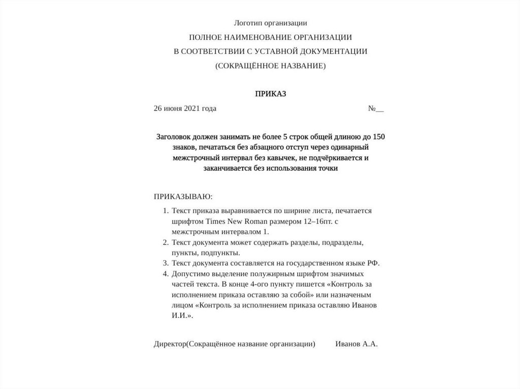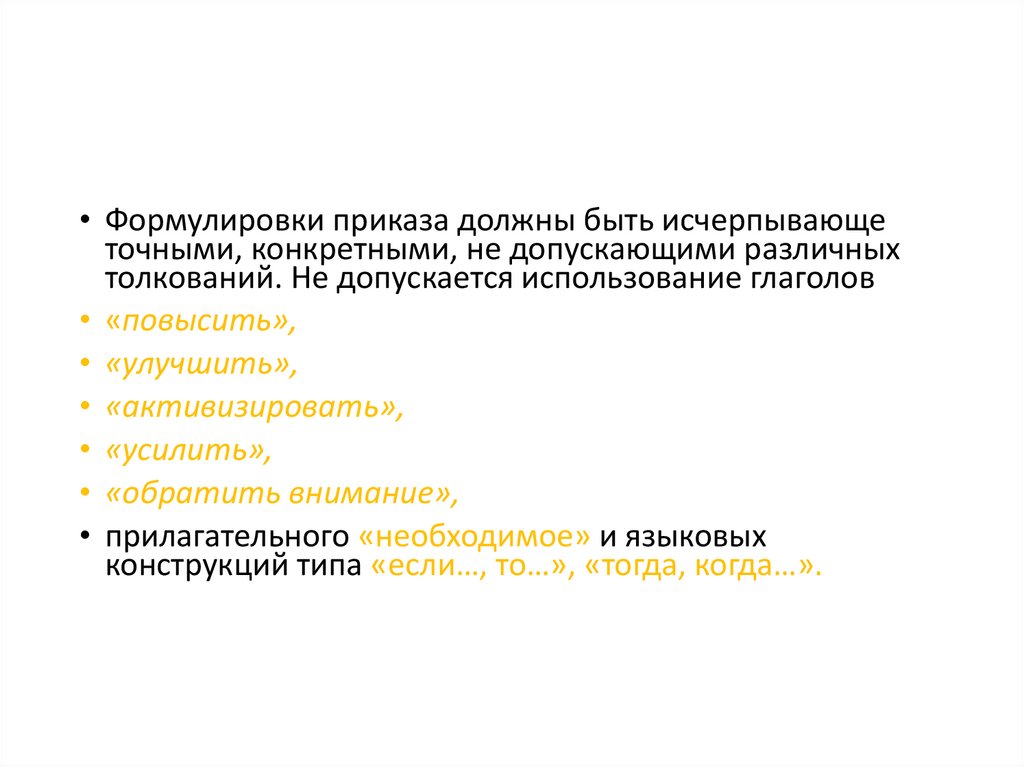 • Формулировки приказа должны быть исчерпывающеточными, конкретными, не допускающими различных