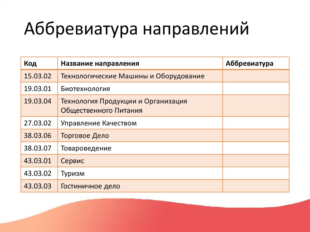 Аббревиатура направленийКод