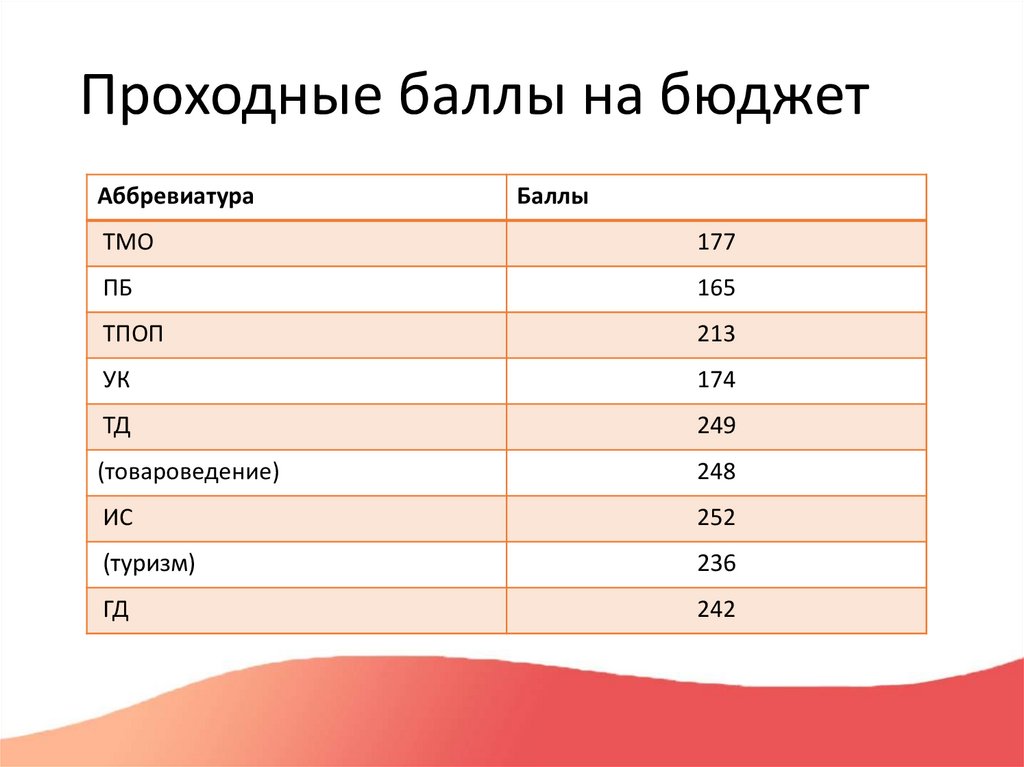 Проходные баллы на бюджетАббревиатура