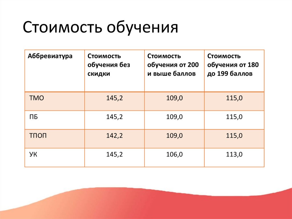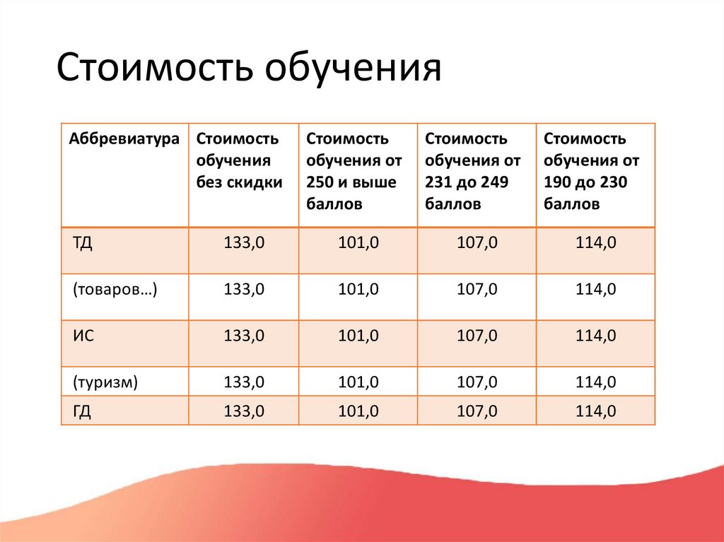 Стоимость обученияАббревиатура Стоимость