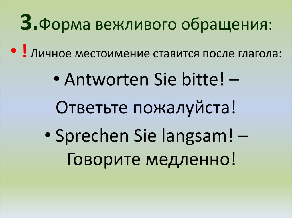 3.Форма вежливого обращения:• ! Личное местоимение ставится после глагола: