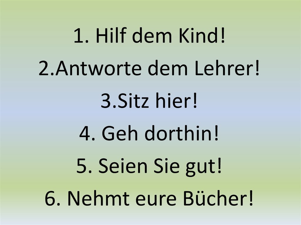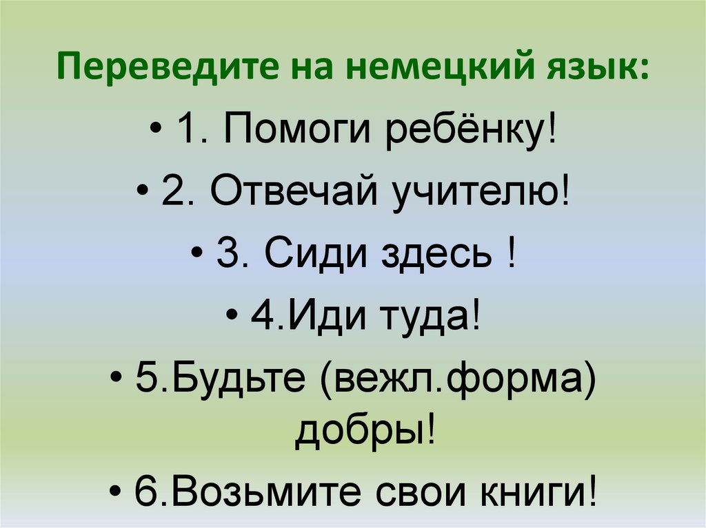 Переведите на немецкий язык:• 1. Помоги ребёнку!