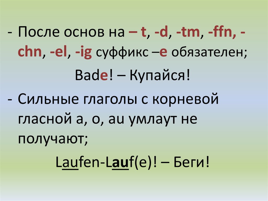 - После основ на – t, -d, -tm, -ffn, chn, -el, -ig суффикс –е обязателен;Bade! – Купайся!