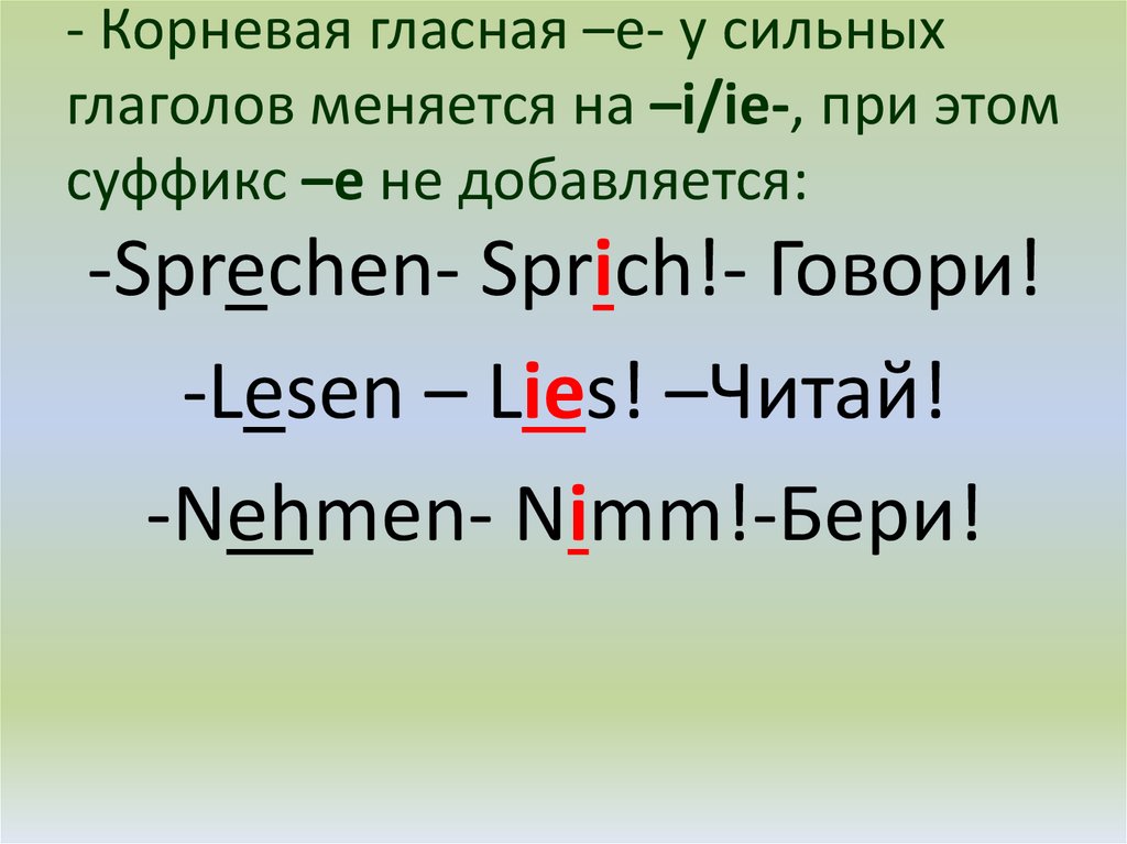 - Корневая гласная –е- у сильныхглаголов меняется на –i/ie-, при этом
