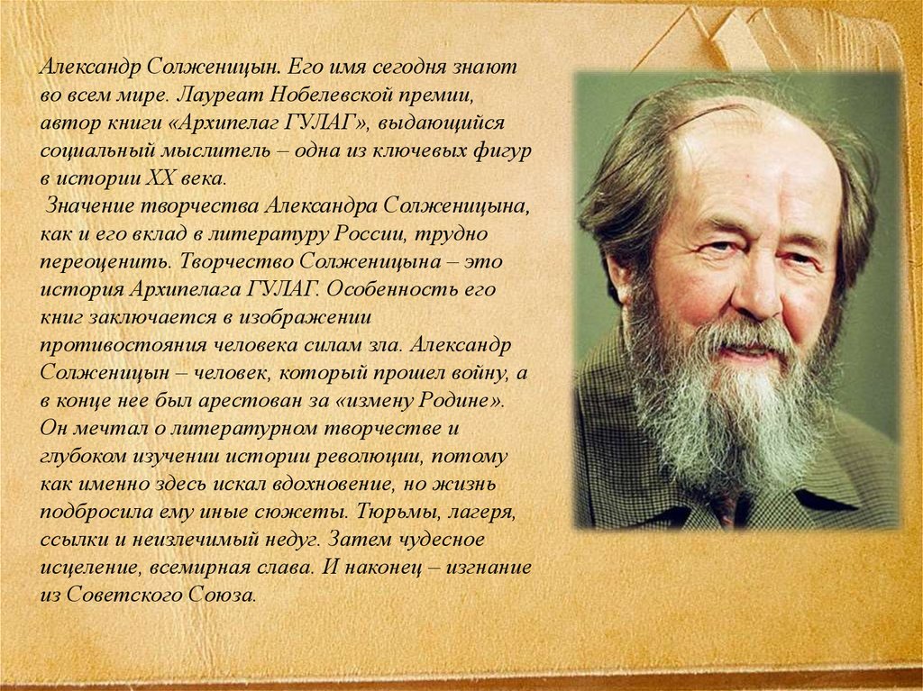 Александр Солженицын. Его имя сегодня знаютво всем мире. Лауреат Нобелевской премии,