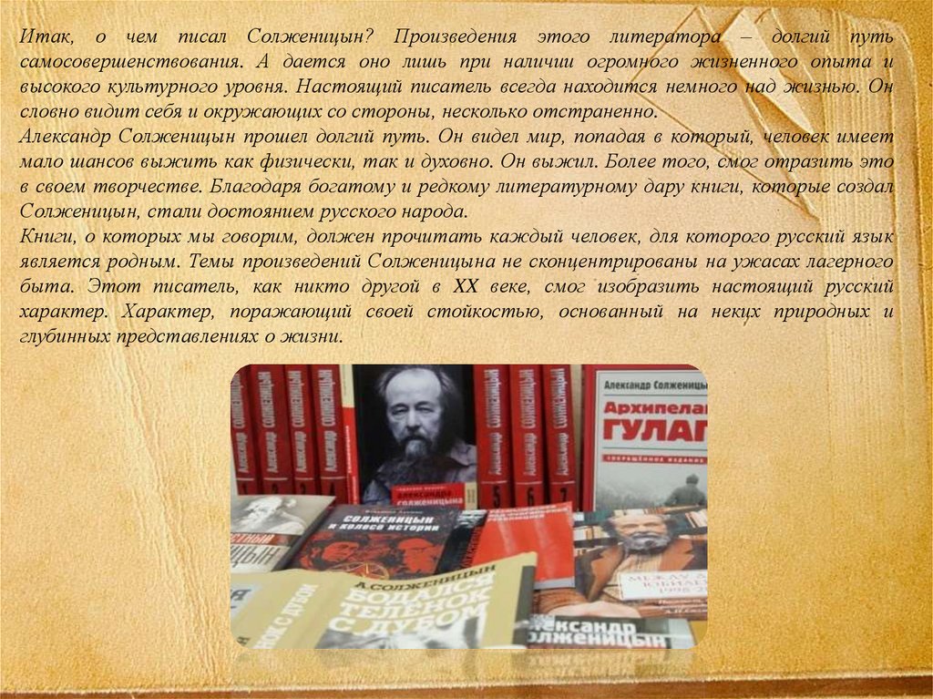 является родным. Темы произведений Солженицына не сконцентрированы на ужасах лагерного