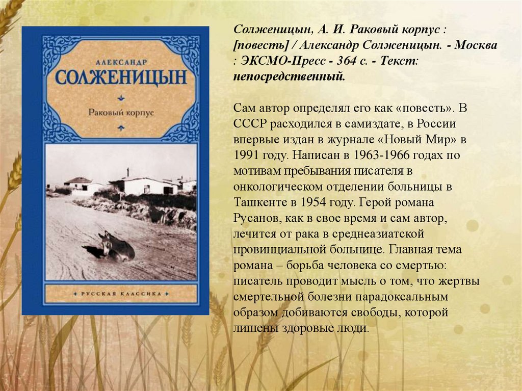 «Матренин двор», а режиссер Андрей Тарковский отмечал роман «Раковый корпус»