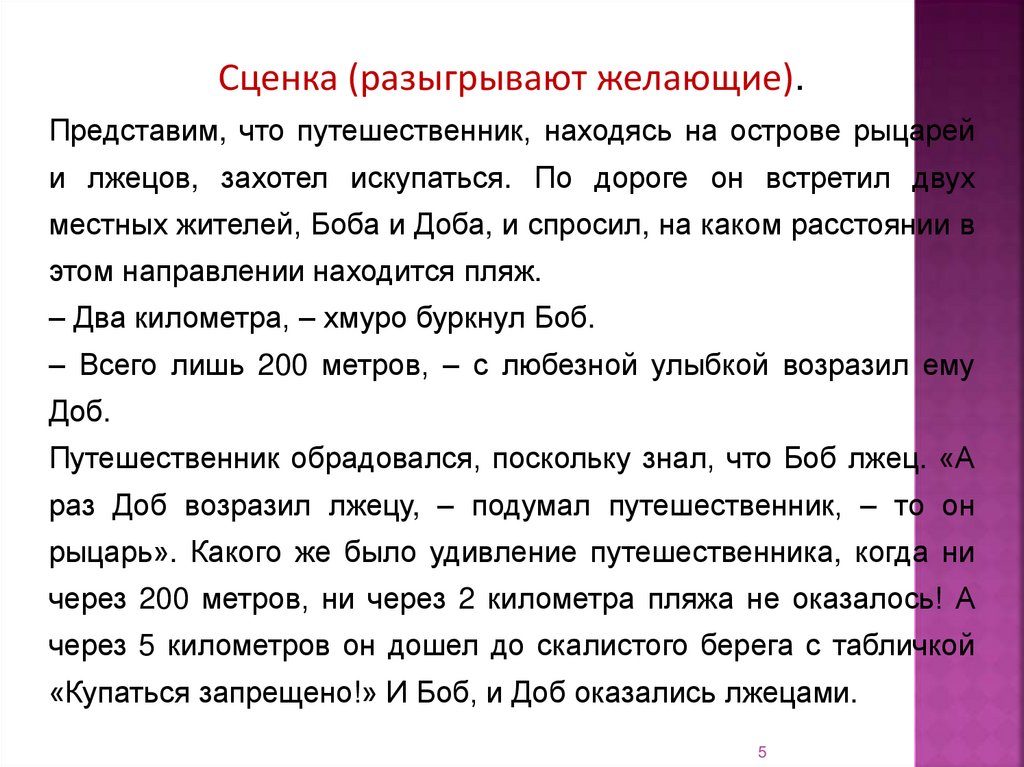 Сценка (разыгрывают желающие).Представим, что путешественник, находясь на острове рыцарей