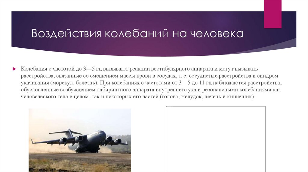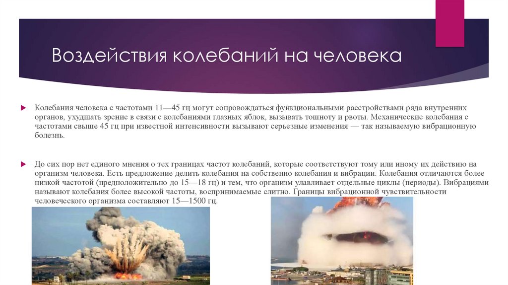 Воздействия колебаний на человекаКолебания человека с частотами 11—45 гц могут сопровождаться функциональными расстройствами ряда внутренних