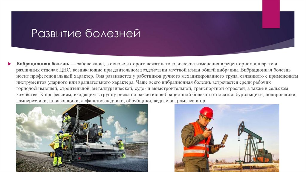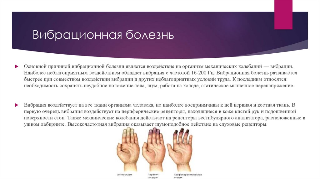 Развитие болезнейВибрационная болезнь — заболевание, в основе которого лежат патологические изменения в рецепторном аппарате и