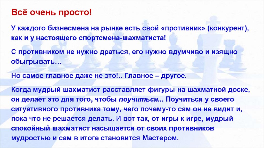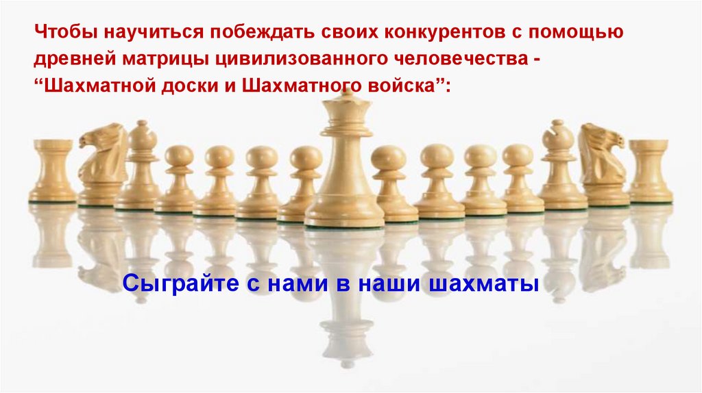 Чтобы научиться побеждать своих конкурентов с помощьюдревней матрицы цивилизованного человечества “Шахматной доски и Шахматного войска”: