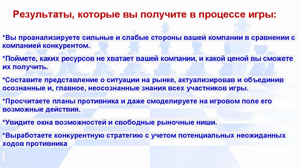 Результаты, которые вы получите в процессе игры:*Вы проанализируете сильные и слабые стороны вашей компании в сравнении с