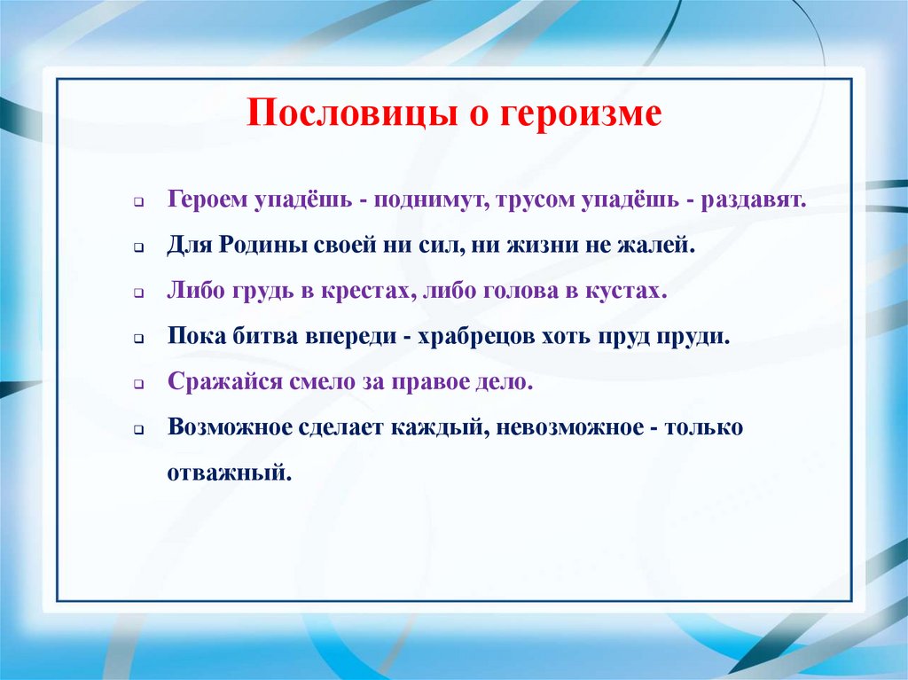 Пословицы о героизмеГероем упадёшь - поднимут, трусом упадёшь - раздавят.
