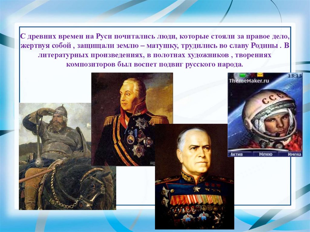 С древних времен на Руси почитались люди, которые стояли за правое дело,жертвуя собой , защищали землю – матушку, трудились во славу Родины . В