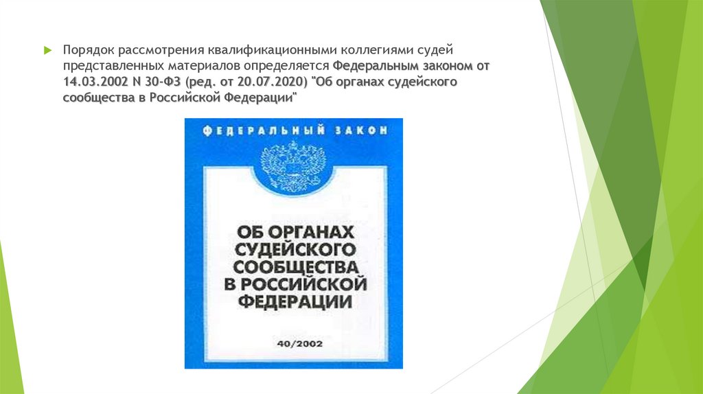 Порядок рассмотрения квалификационными коллегиями судейпредставленных материалов определяется Федеральным законом от