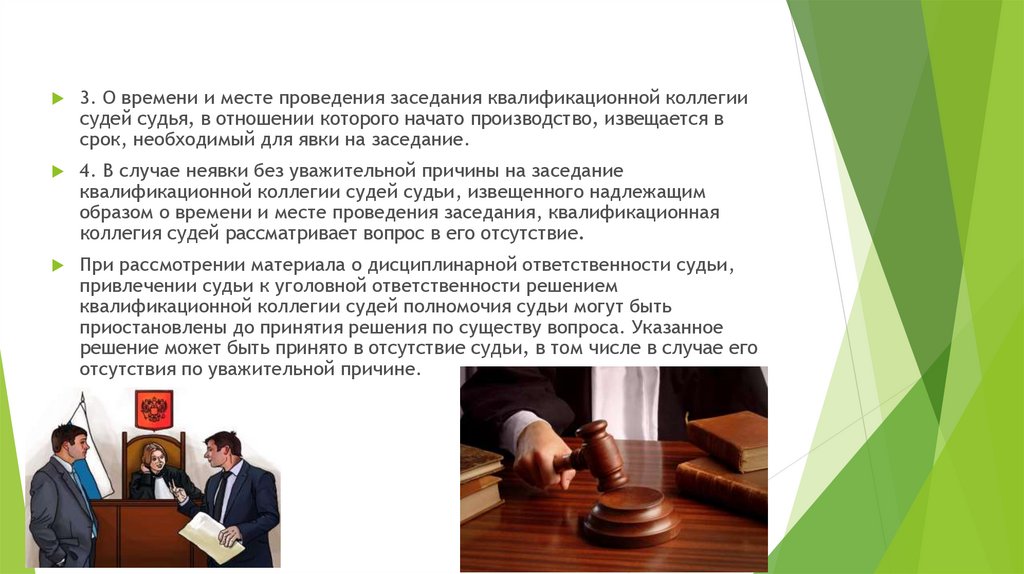 3. О времени и месте проведения заседания квалификационной коллегиисудей судья, в отношении которого начато производство, извещается в